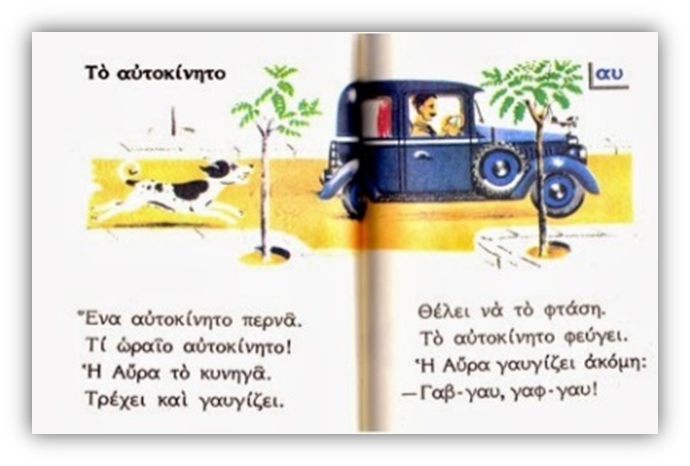 Η τεχνολογία εισέρχεται στο αλφαβητάρι. Μία σκηνή με αυτοκίνητο. Τότε πολύ λίγα αυτοκίνητα κυκλοφορούσαν στους δρόμους. Το αυτοκίνητο ήταν δείγμα οικονομικής ευμάρειας και πλούτου, όνειρο άπιαστο για τους περισσότερους Έλληνες.